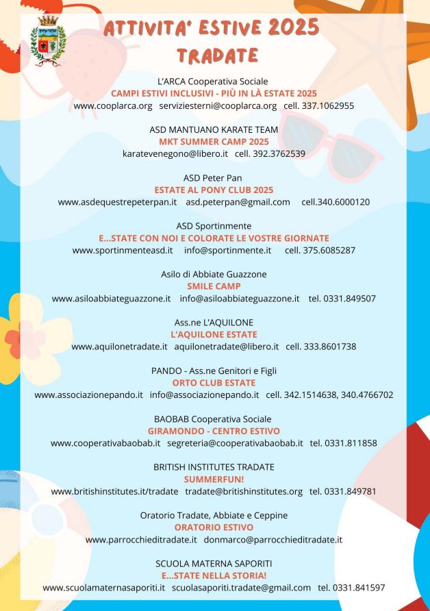 Il Comune di Tradate in collaborazione con le realtà del territorio presenta le proposte di attività estive per bambini e ragazzi