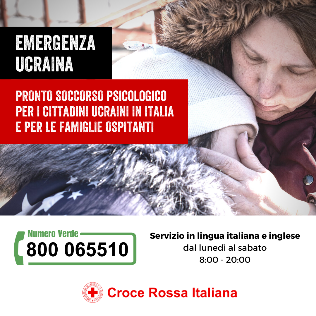 La Croce Rossa Italiana ha organizzato il servizio di Pronto soccorso psicologico per i cittadini ucraini in Italia e per le famiglie ospitanti. E’ possibile contattare il Servizio chiamando il numero verde 800.065510 dal lunedƬ al sabato dalle ore 8.00 alle ore 20.00.